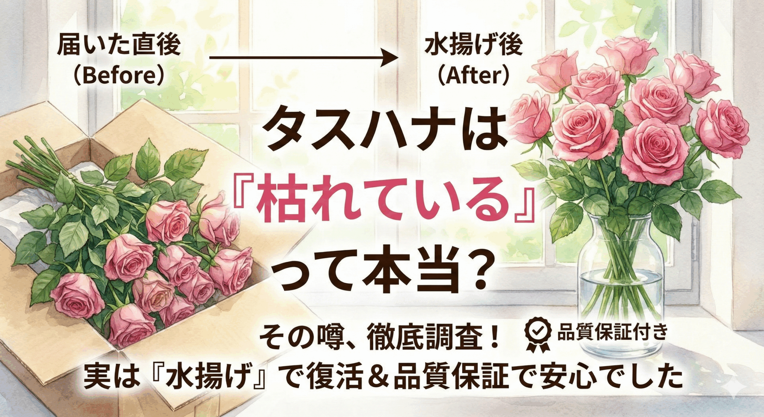結論から言うと、「枯れている」という口コミはごく一部ありますが、ほとんどは「水あげ」で復活します。しかも、万が一のときは「品質保証(再送)」があるので安心です!