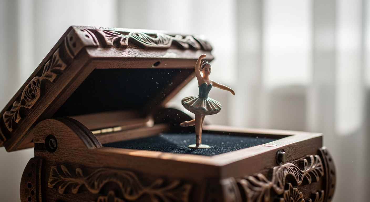 この宝石箱の最大の魅力は、なんといってもオルゴール機能。背面のゼンマイをそっと巻いて蓋を開けると、可憐なバレリーナがくるくると回りながら、美しいメロディーを奏でます。このアナログな仕掛けが、なんとも言えない愛おしさを感じさせるんですよね。