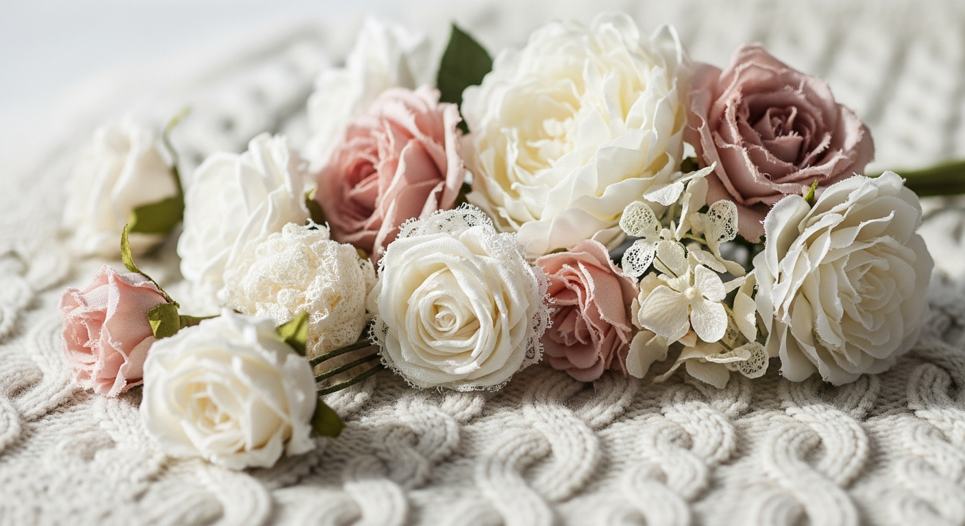このブランケットの最大の特徴は、なんといっても立体的に編まれたバラの花モチーフです。一枚一枚、花びらを編み重ねていくことで、まるで本物のバラのような豪華なモチーフが完成します。平面的なプリント柄とは全く違う、手編みならではの温かみと高級感があります。