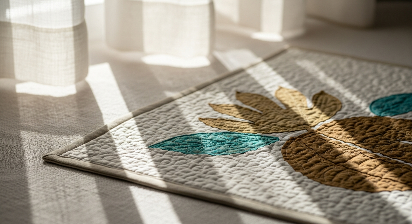 このキットの最大の特徴は、なんといっても「しつけ済み」であること。ハワイアンキルトで一番手間がかかり、挫折しやすいのが、図案を布に写して、モチーフの布(アップリケ)を土台布に「しつけ縫い」で固定する作業なんです。このキットは、その一番面倒な工程がすでに完了した状態で届きます。つまり、袋から出したら、すぐにキルティングを始められるというわけです。